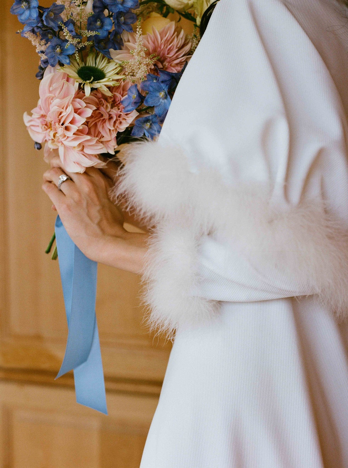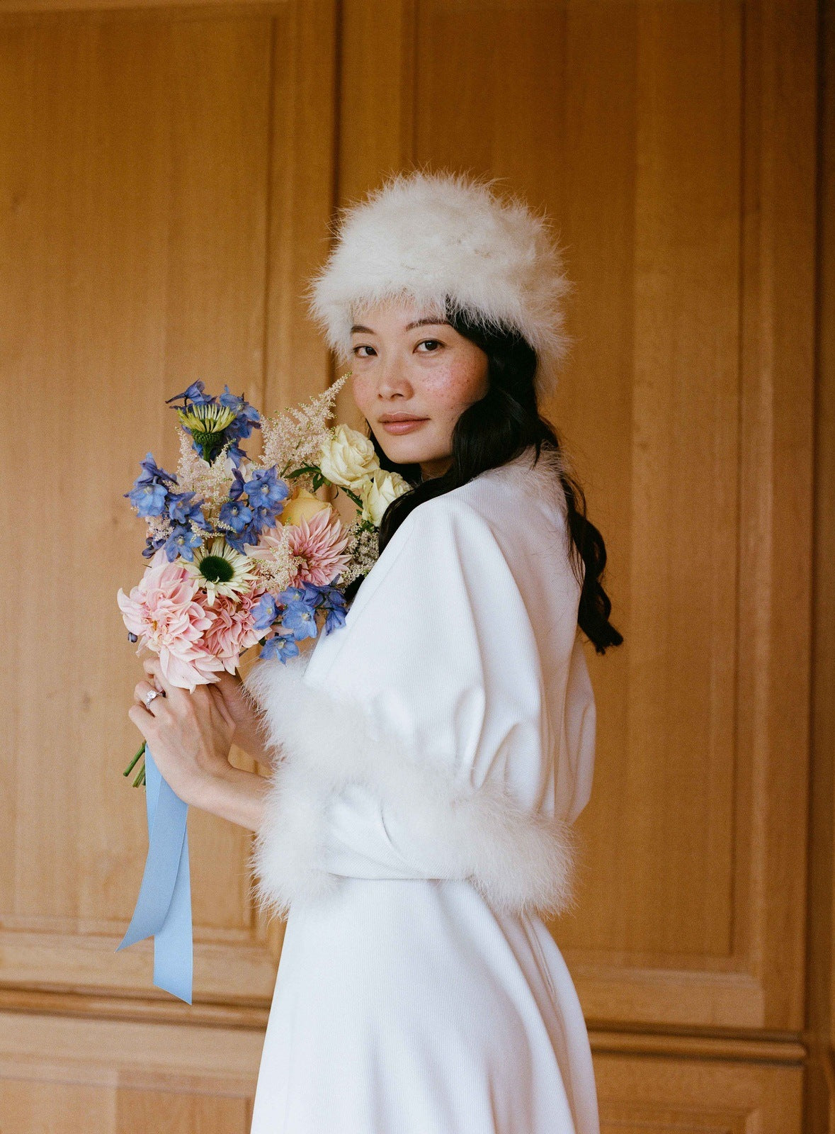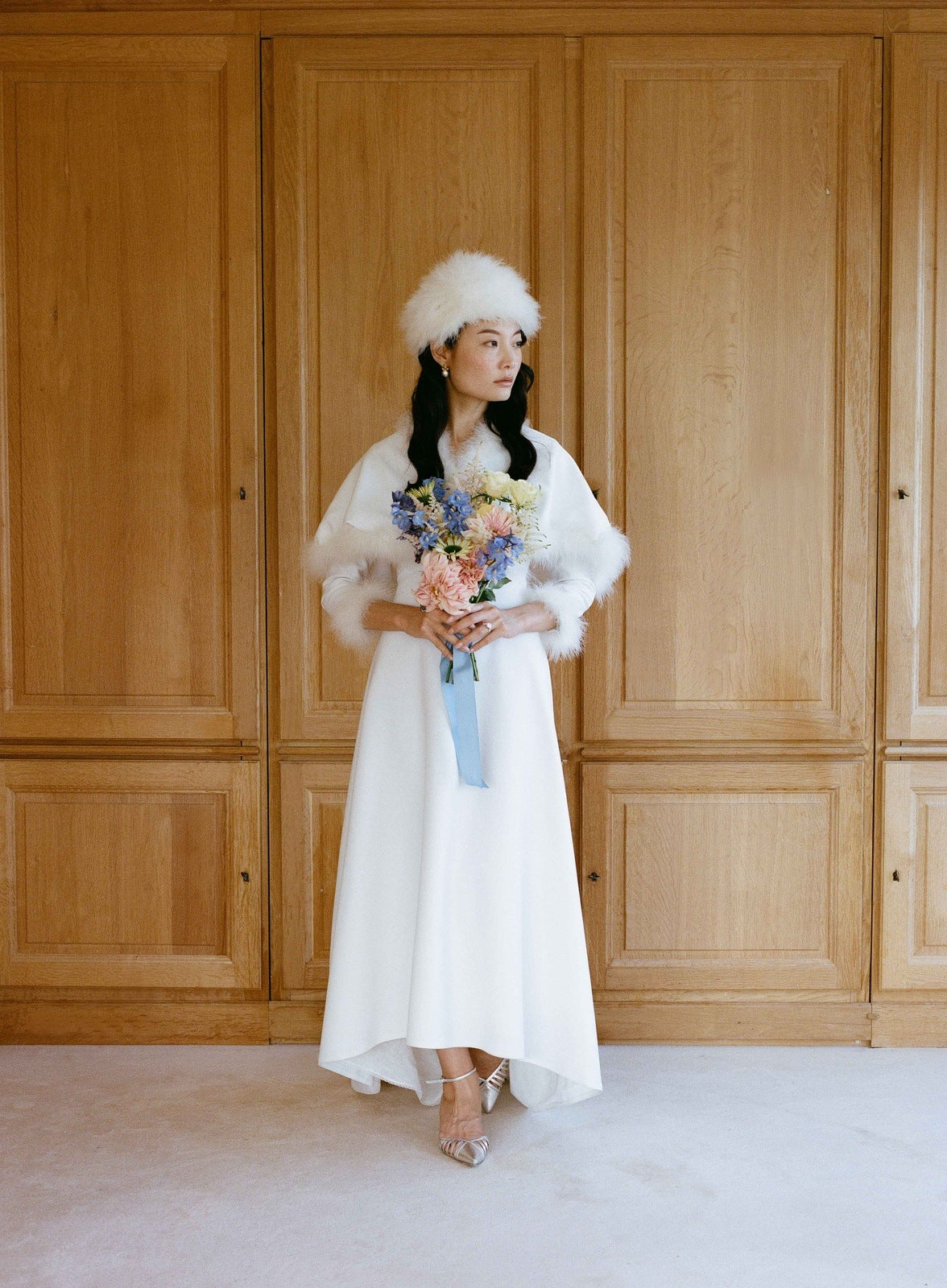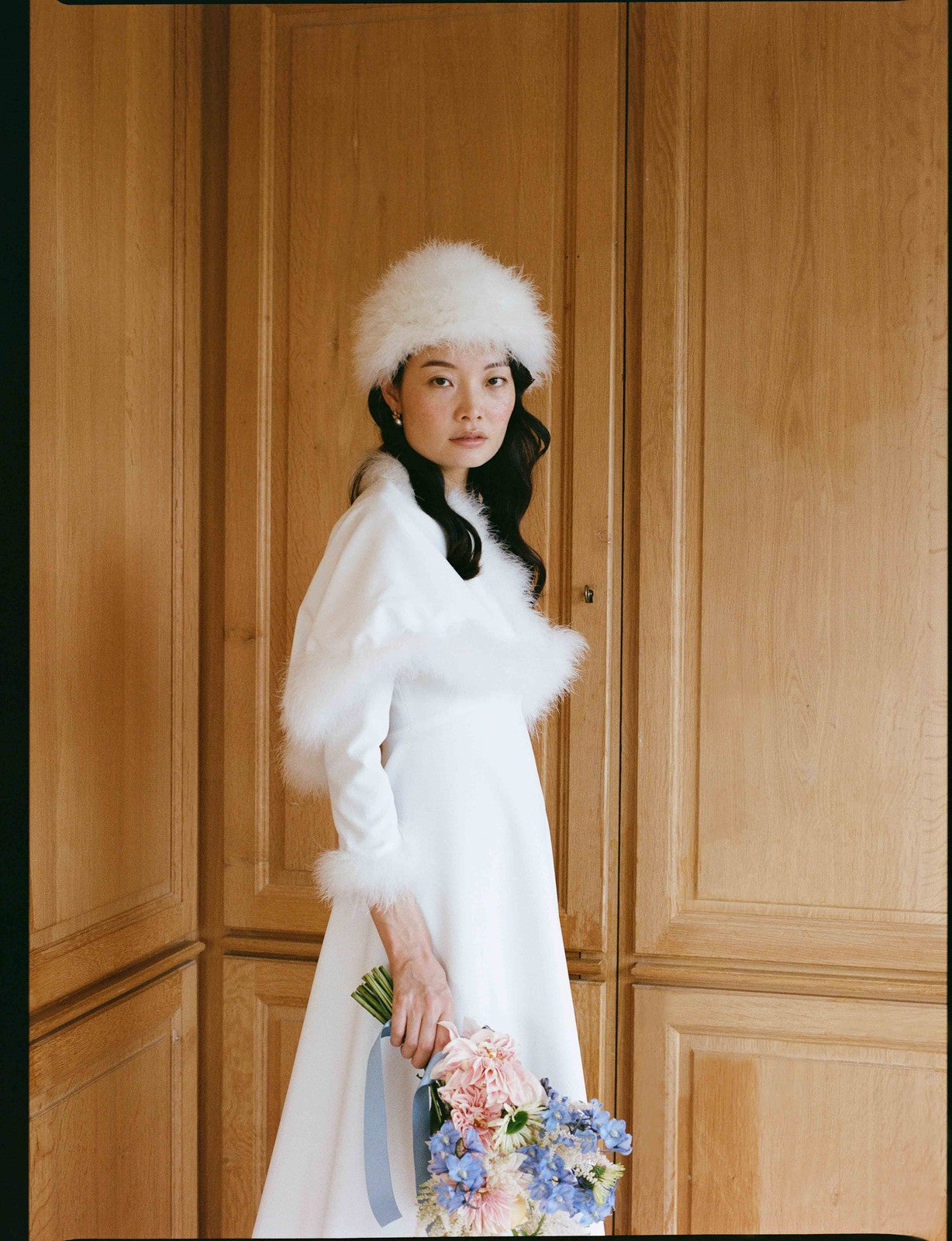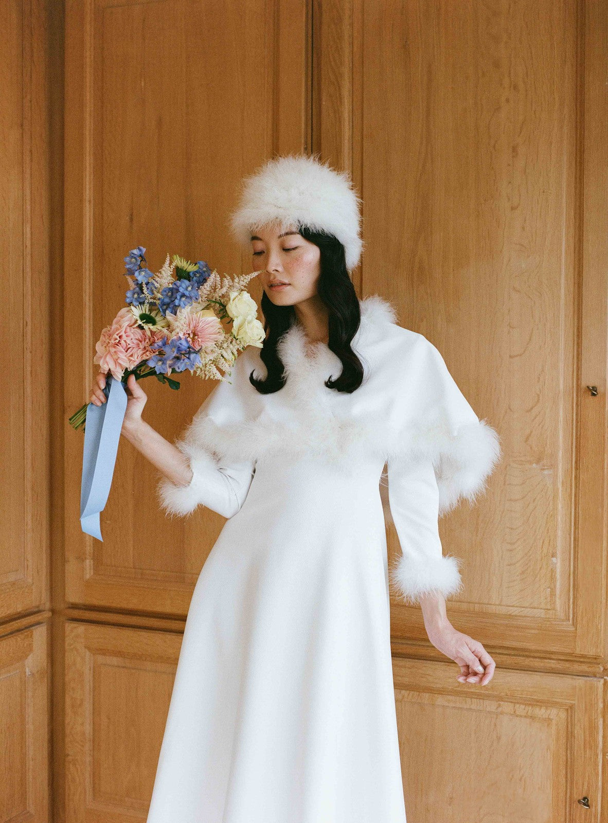Sa coupe croisée souligne naturellement la taille, tout en offrant confort et douceur. Une robe pensée pour braver le froid avec style, tout en célébrant l’amour dans un éclat de lumière blanche.