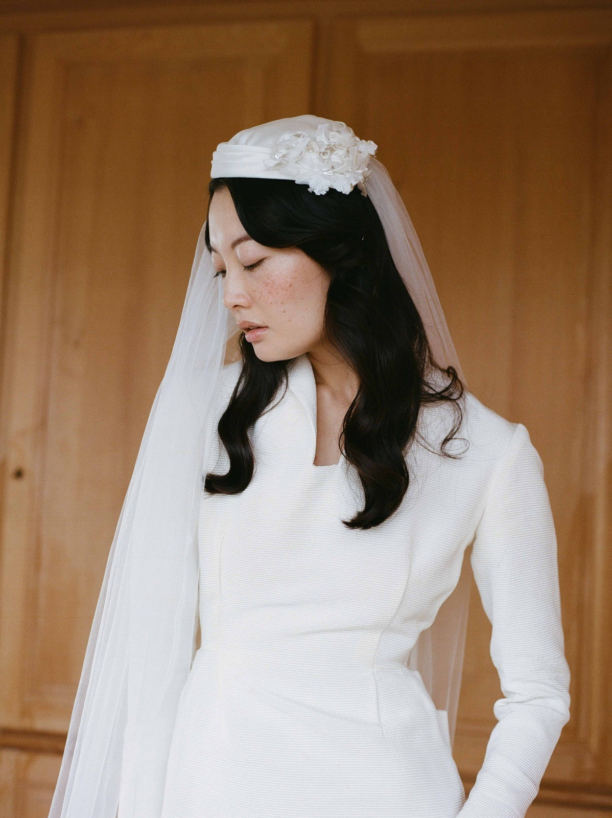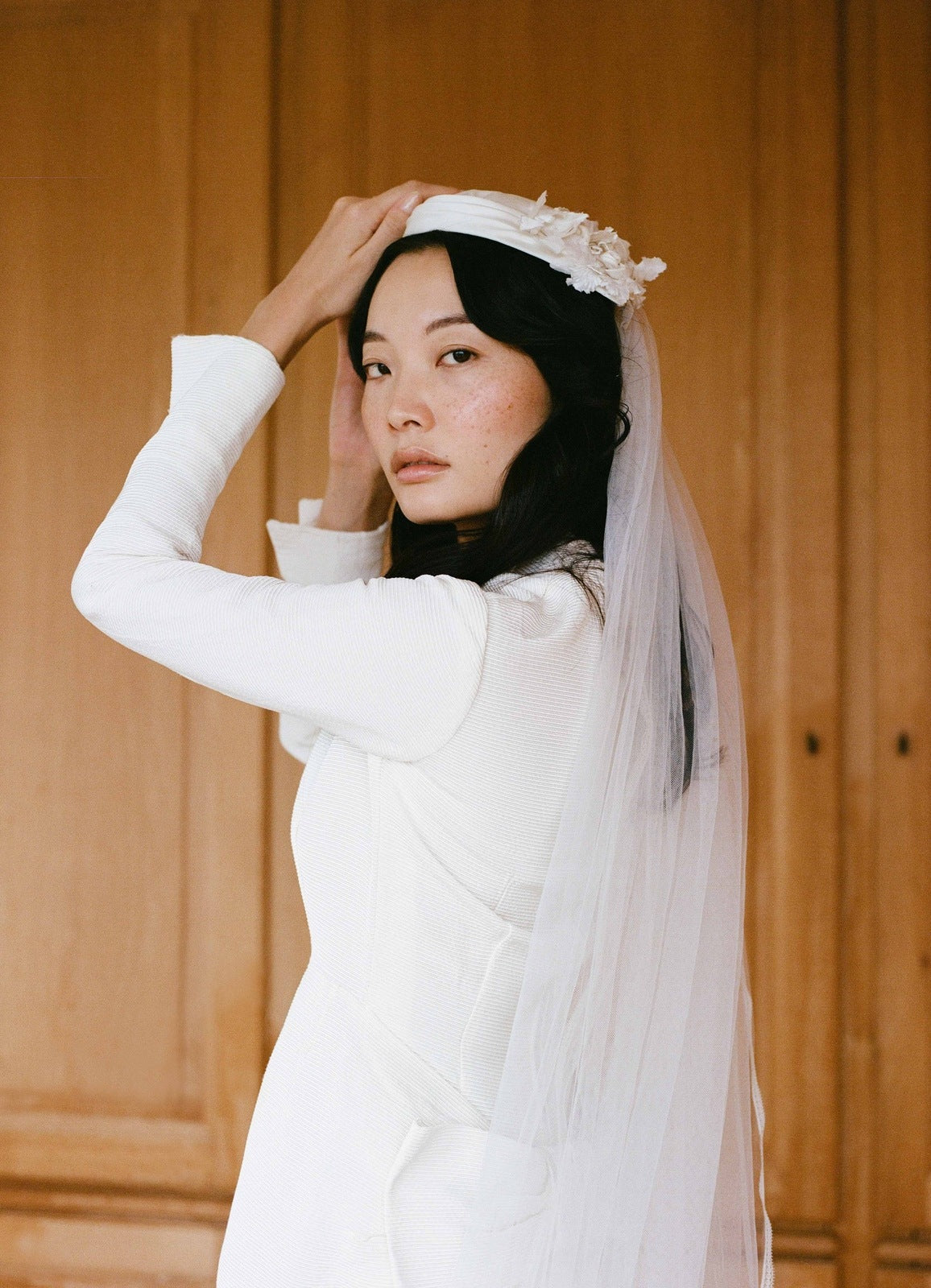 À mi-chemin entre modernité architecturale et romantisme rétro, cette robe évoque une mariée au charme sobre, sûre d’elle et empreinte de délicatesse — une allure d’une pureté classique, sublimée par la subtilité du détail.