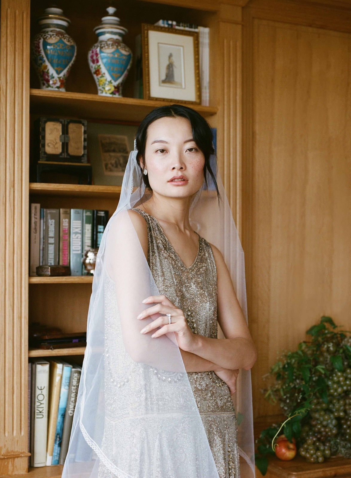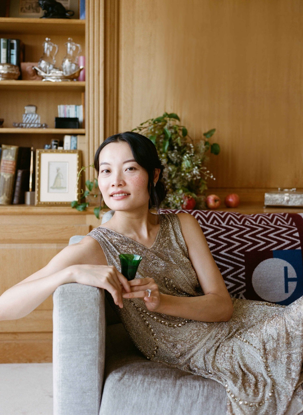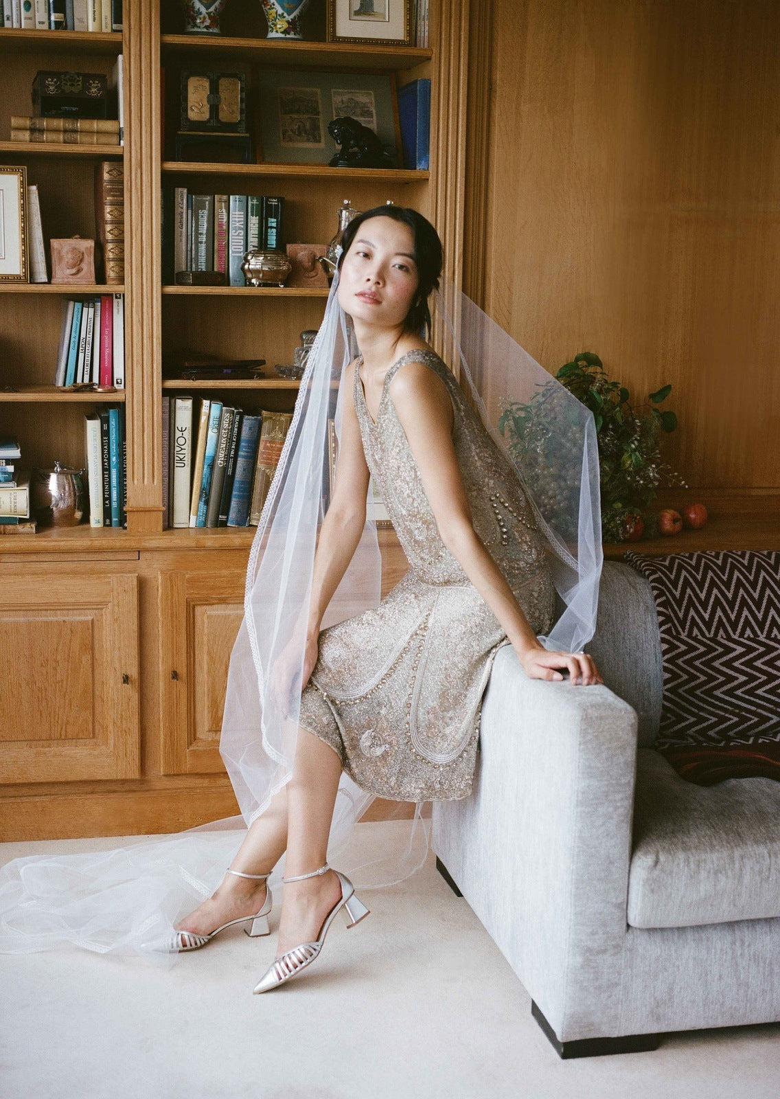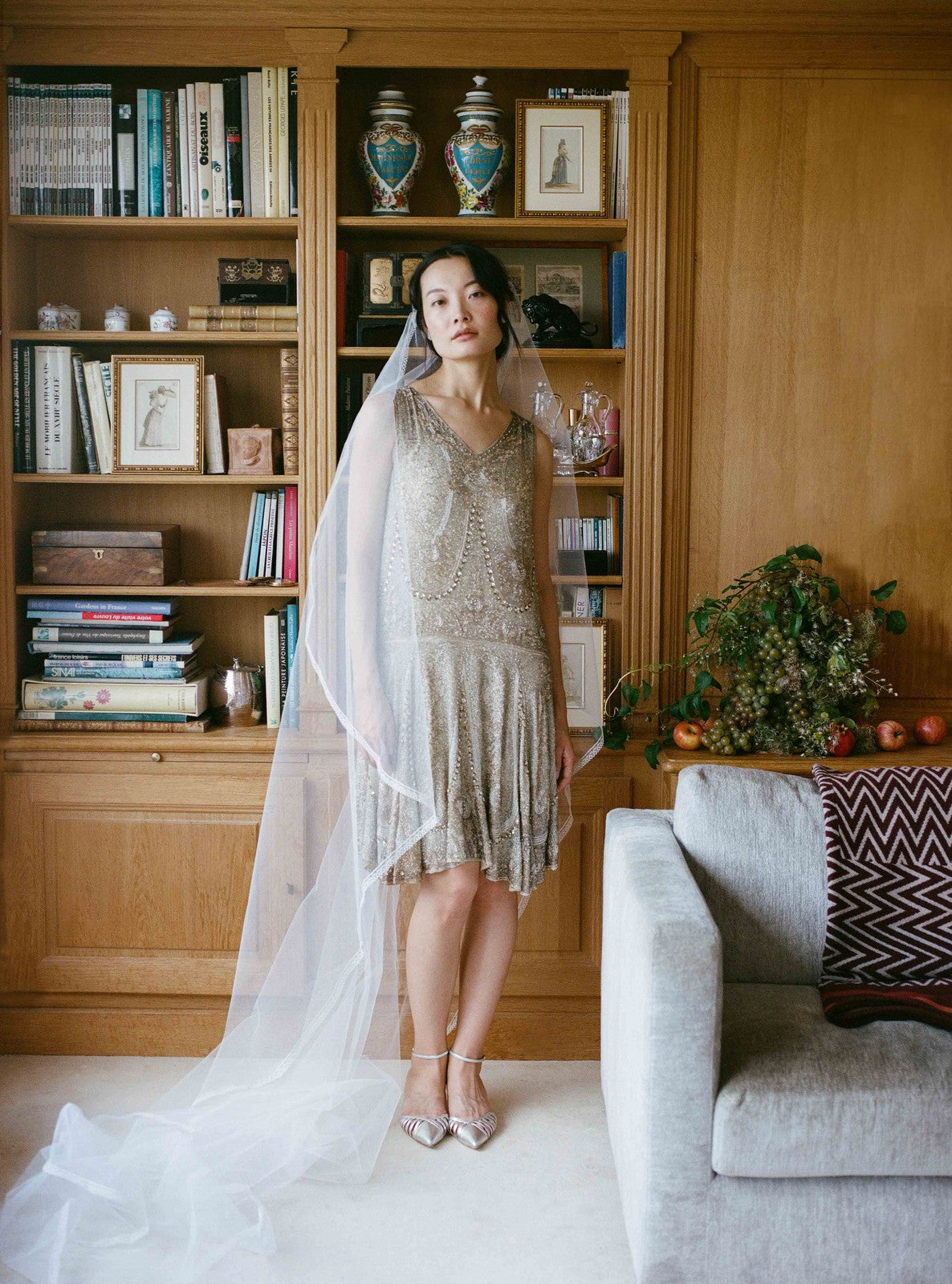 La coupe droite et la taille basse typiques de l’époque créent une allure gracieuse et libre, tandis que le décolleté en V et l’ourlet dansant apportent féminité et mouvement. Chaque perle, cousue à la main, reflète la lumière avec élégance, évoquant l’esprit festif et raffiné des années folles.