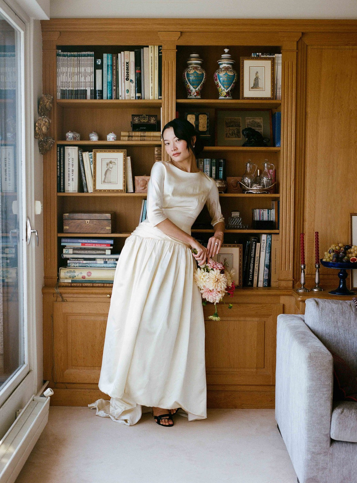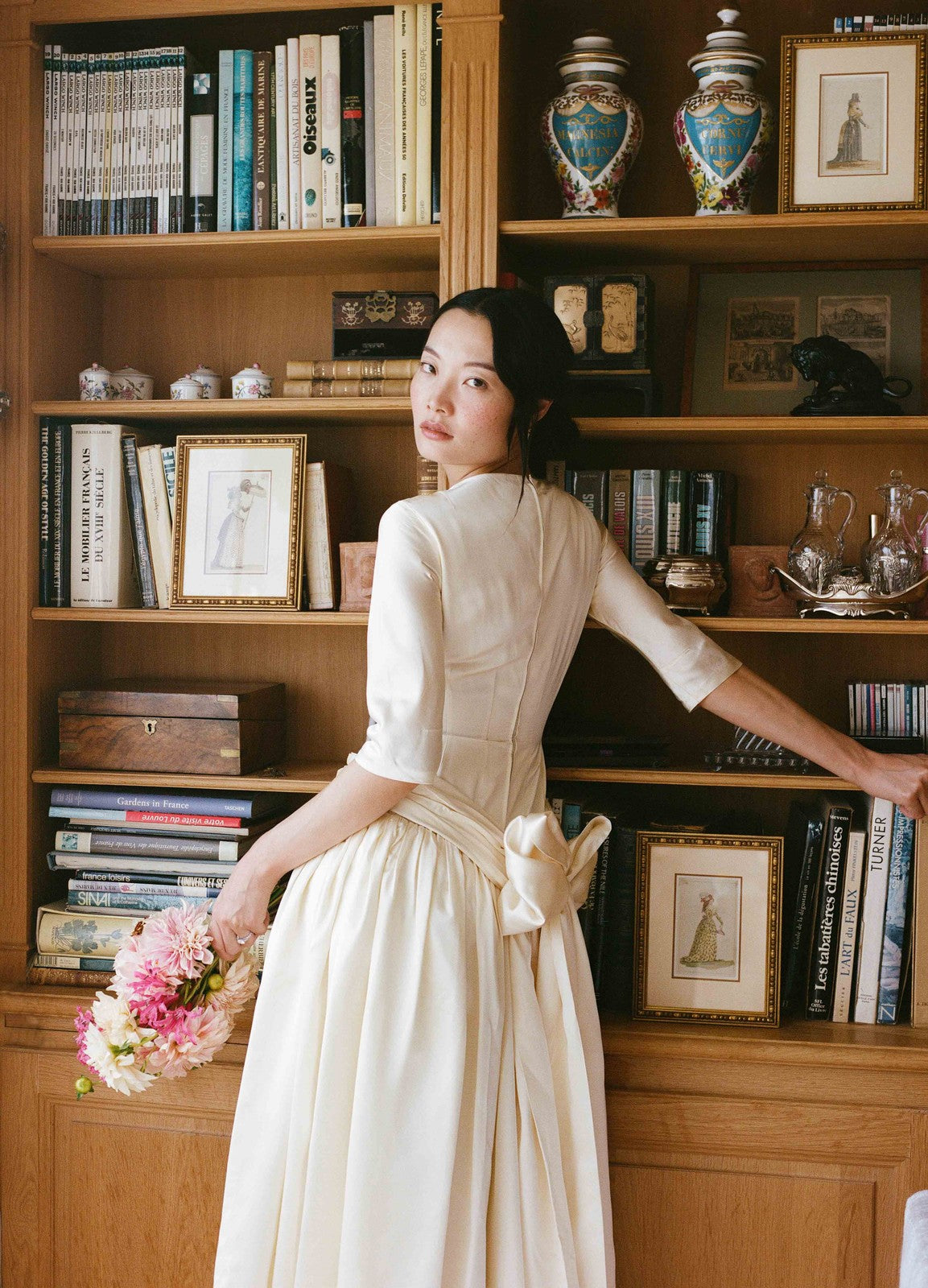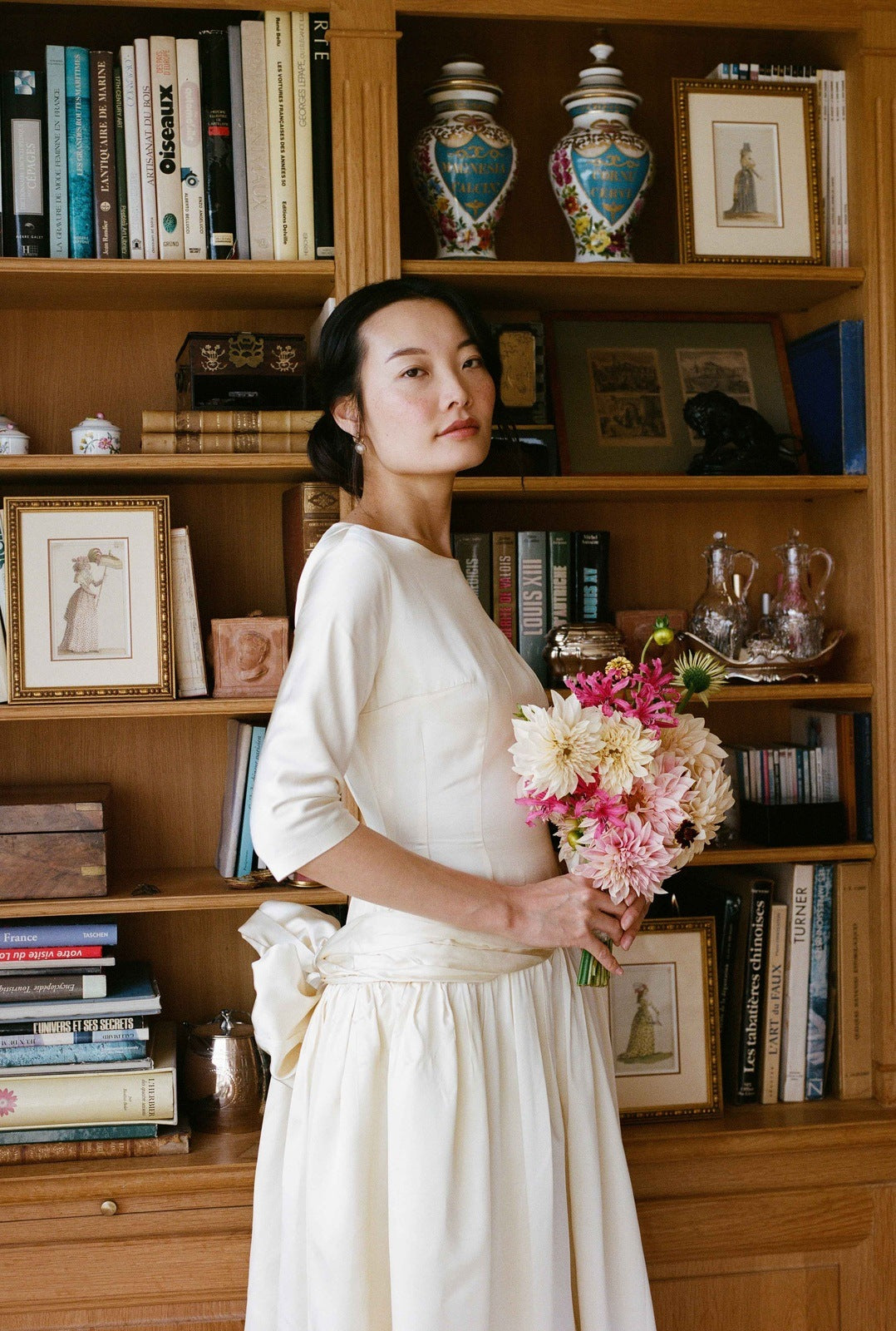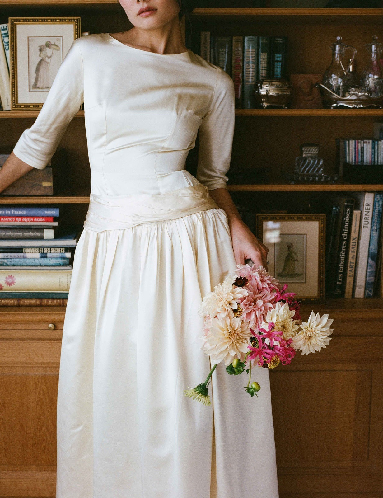 La jupe, ample et fluide, tombe en de doux plis, captant la lumière à chaque mouvement. Le satin de soie, au tombé souple et à la brillance discrète, donne à la robe une aura à la fois précieuse et naturelle. Cette pièce évoque les mariages d’une époque où la féminité se traduisait par la pureté des lignes et la qualité des matières, entre grâce rétro et modernité discrète.