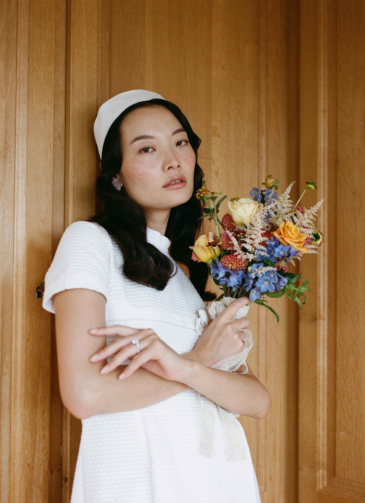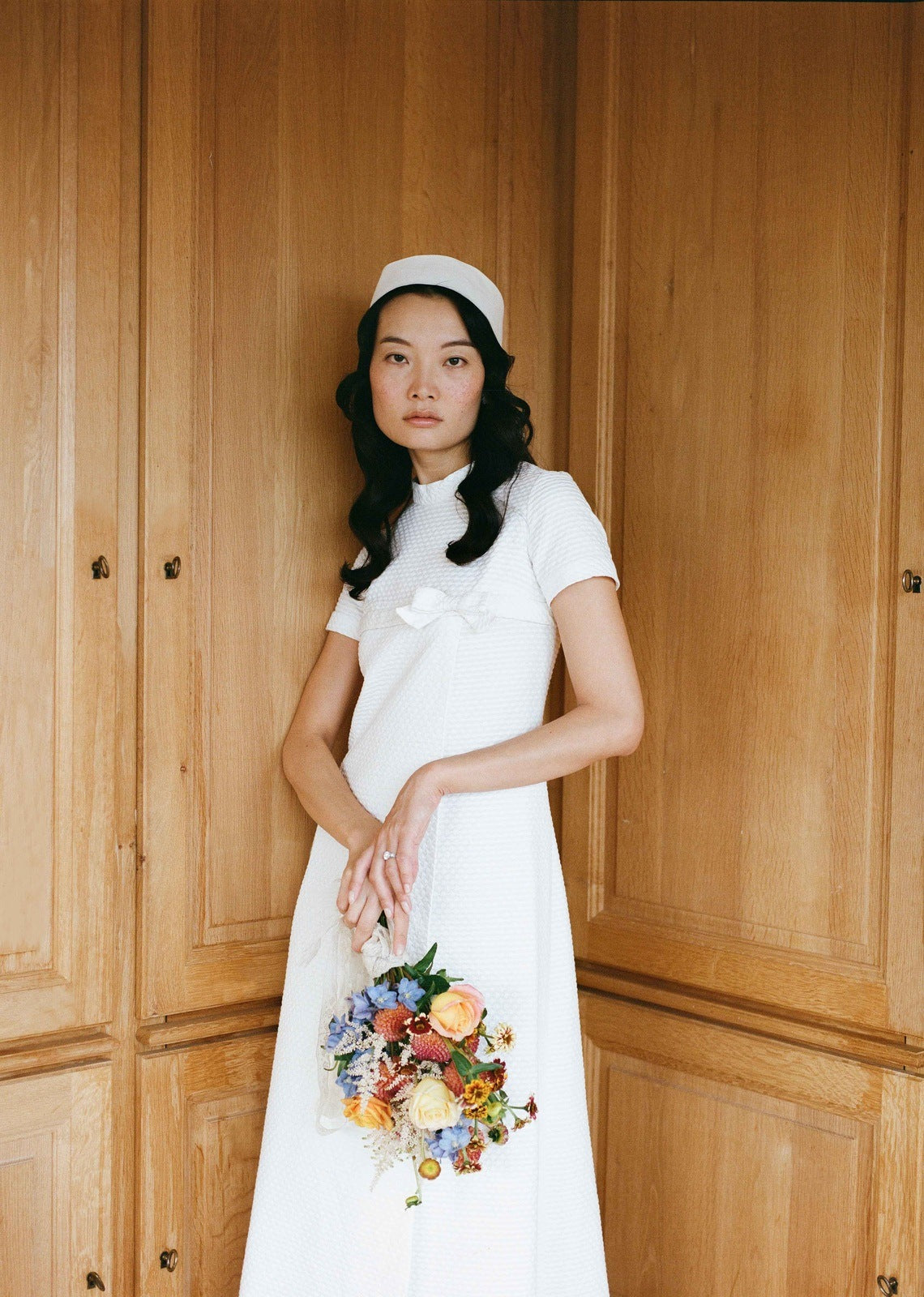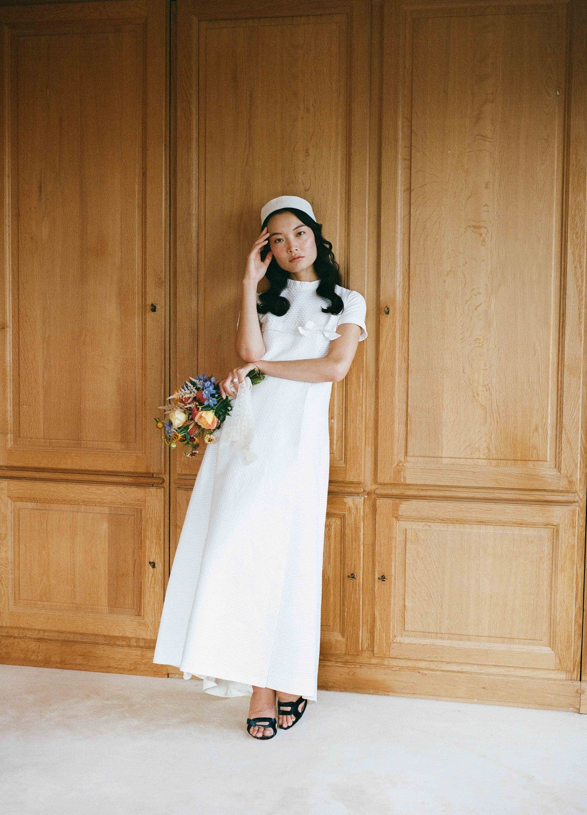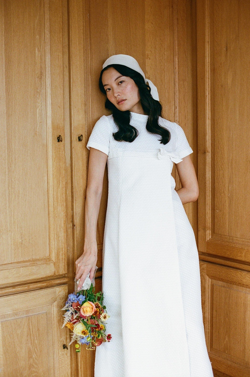 Associée à un bandana simple, elle robe incarne une grâce intemporelle — celle d’une mariée moderne qui puise son inspiration dans la pureté et la simplicité des sixties.