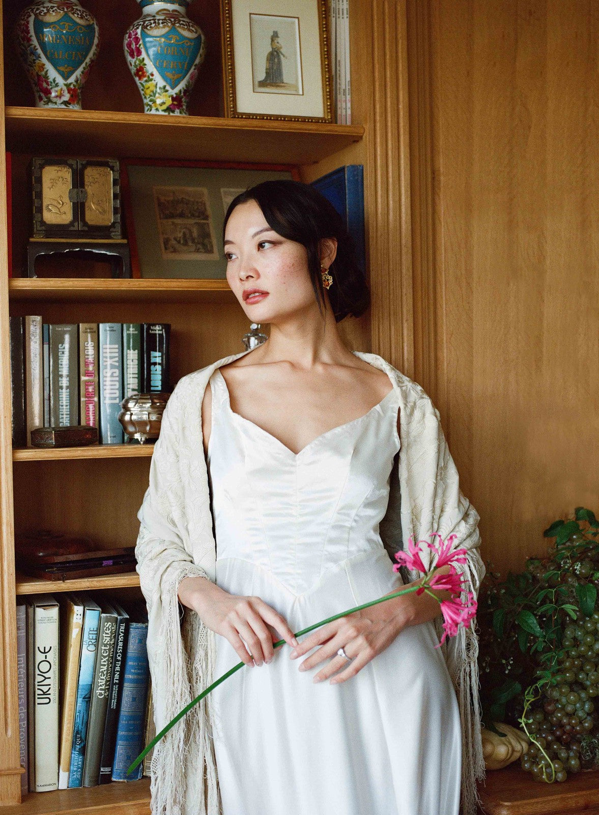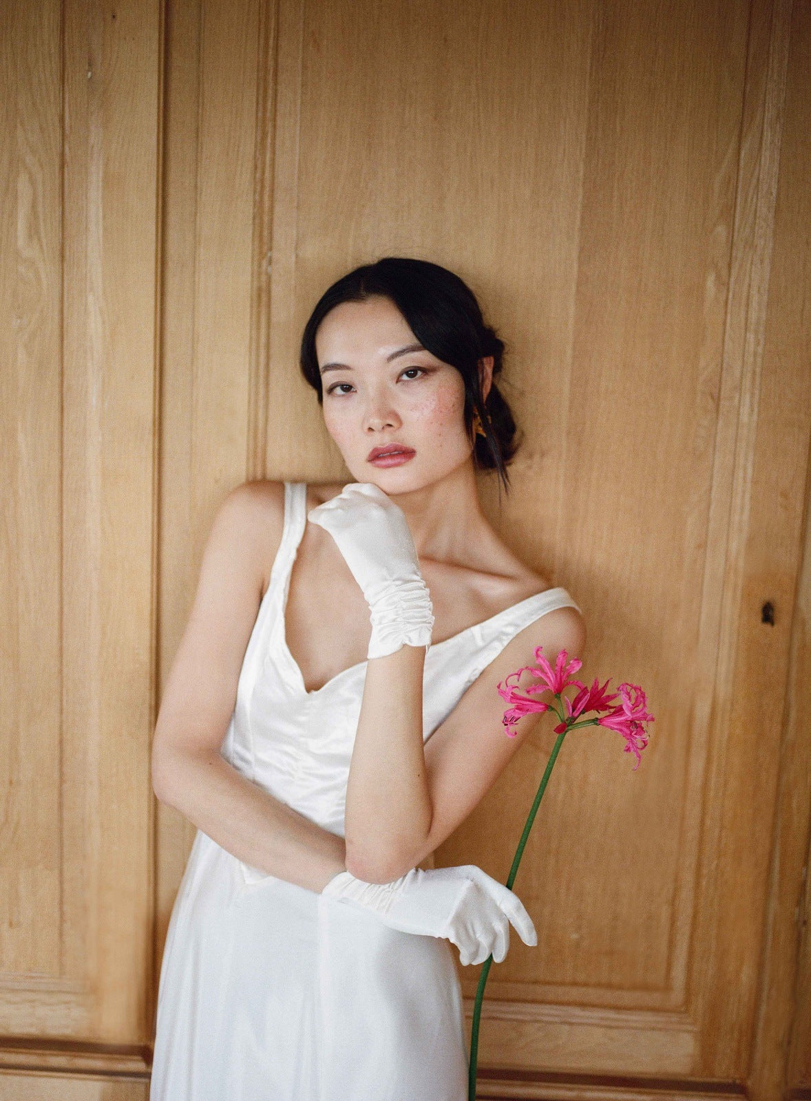 Confectionnée dans une soie lumineuse au tombé parfait, cette robe allie sensualité et pureté. Ses lignes épurées rappellent les grandes silhouettes hollywoodiennes des années 1930, tout en conservant une modernité discrète.
